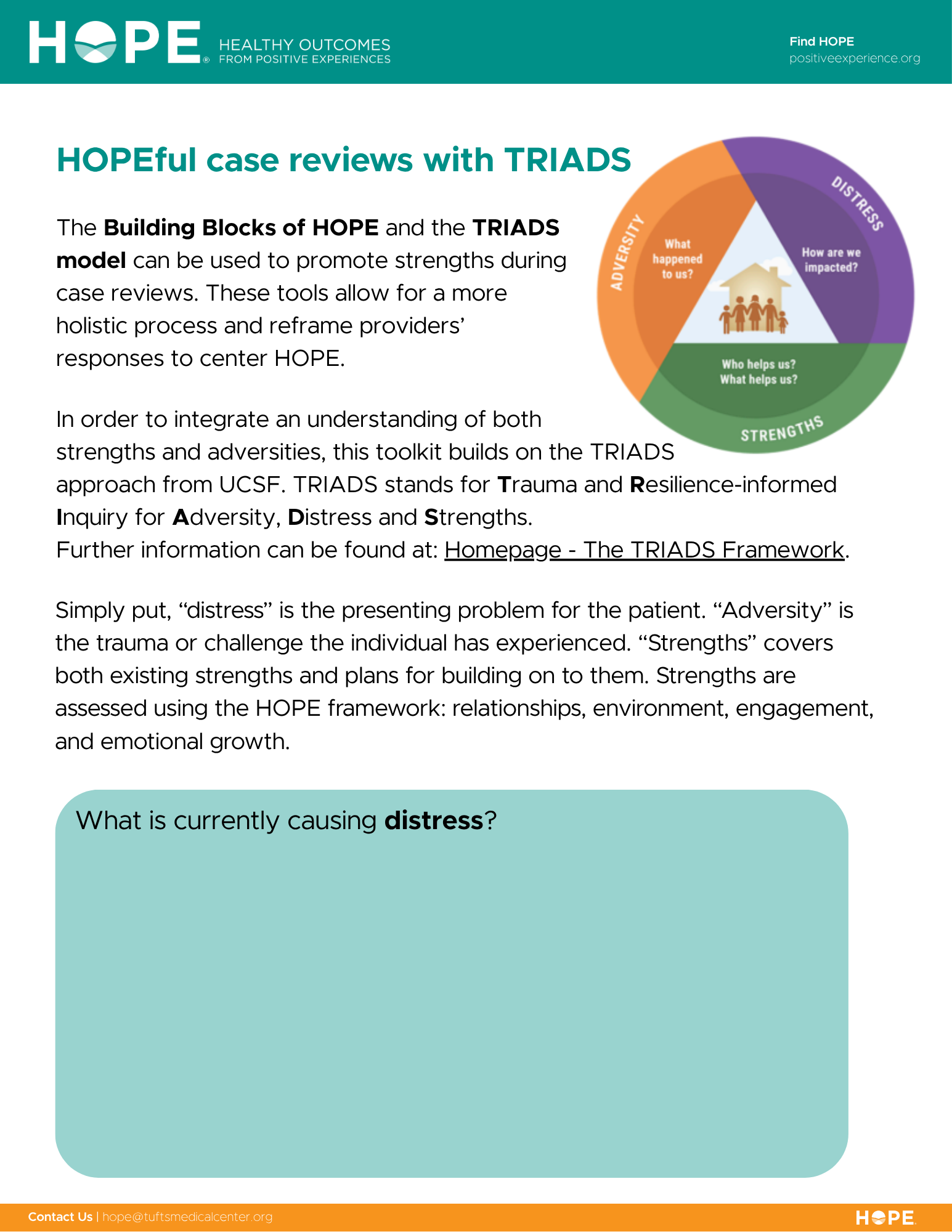 The Building Blocks of HOPE and the TRIADS model can be used to promote strengths during case reviews. These tools allow for a more holistic process and reframe providers’ responses to center HOPE.