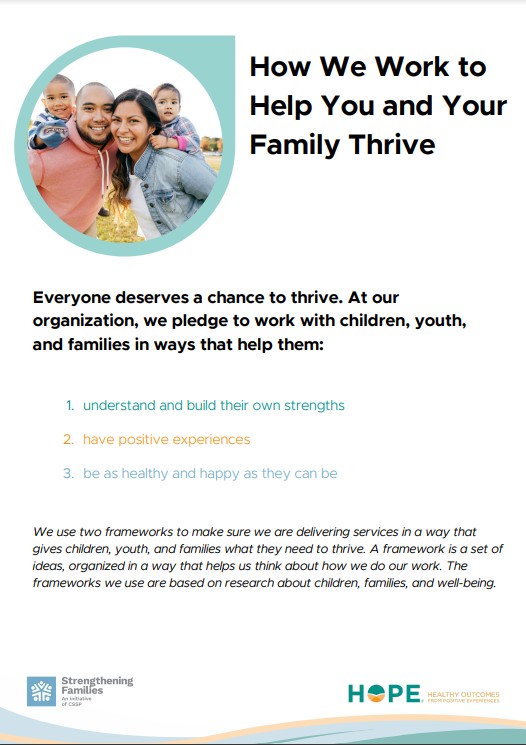 This resource shares how families can benefit from the HOPE (Healthy Outcomes from Positive Experiences) framework which covers the Four Building Blocks of HOPE and the Strengthening Families framework which focuses on five protective factors. Using tips detailed in this resource, families can increase their children’s access to the Four Building Blocks of HOPE and build their own Protective Factors.