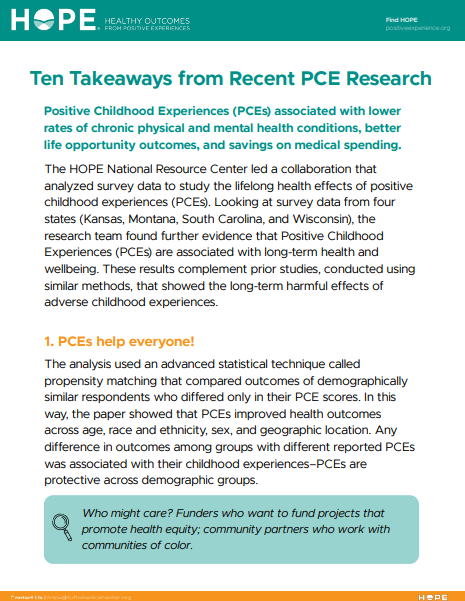 The HOPE National Resource Center led a collaboration that analyzed survey data to study the lifelong health effects of positive childhood experiences (PCEs). Looking at survey data from four states (Kansas, Montana, South Carolina, and Wisconsin), the research team found further evidence that Positive Childhood Experiences (PCEs) are associated with long-term health and wellbeing. These results complement prior studies, conducted using similar methods, that showed the long-term harmful effects of adverse childhood experiences.