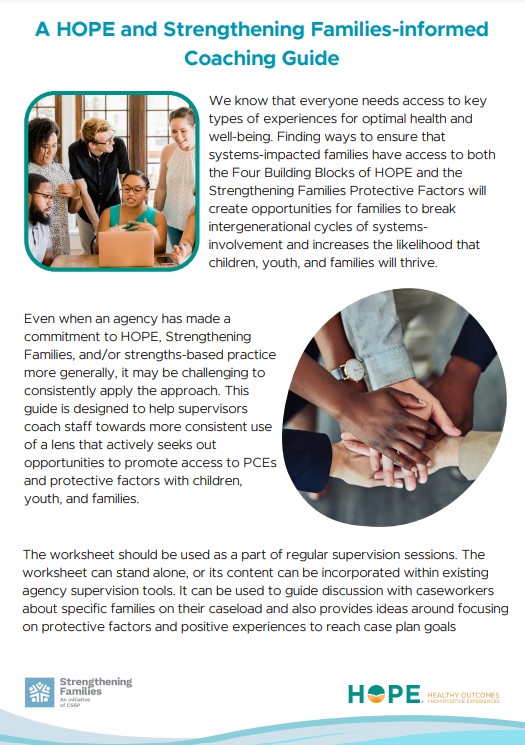 This guide is designed to help supervisors coach staff toward more consistent use of the HOPE and Strengthening Families frameworks that actively seeks out opportunities to promote access to positive childhood experiences (PCEs) and protective factors with children, youth, and families.