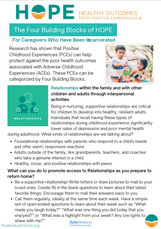 This Four Building Blocks of HOPE resource is tailored specifically for caregivers who have experienced incarceration. In recognition of the unique challenges faced by this community, this resource offers practical strategies to navigate the journey of having an incarcerated caregiver and promote the Four Building Blocks of HOPE. From fostering relationships to creating nurturing environments, each building block is crafted to empower caregivers with the tools they need to foster hope and resilience.