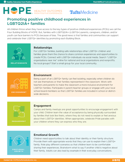 All children thrive when they have access to the key types of positive childhood experiences (PCEs) we call the Four Building Blocks of HOPE. But, families with LGBTQ2IA+ (LGBTQ+) parents, caregivers, children, and/or youth can face barriers to PCEs because of bias. The good news is that families and communities can support and celebrate their LGBTQ+ identities by promoting each Building Block.