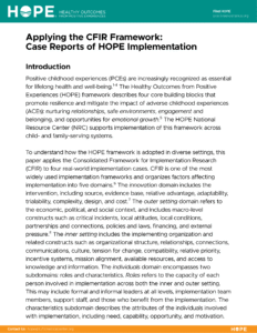 The HOPE framework is implemented by organizations nationwide to meet the needs of their local context. This paper applies the Consolidated Framework for Implementation Research (CFIR) to four real-world cases: Tufts Pediatrics, Spokane Regional Health District, San Diego YMCA, and a national academic detailing project. CFIR is a widely used, practical framework that (1) helps implementation sciences conceptualize programming and projects and (2) guides implementers in choosing strategies, identifying needs and adaptations, involving the right people, and explaining impact.