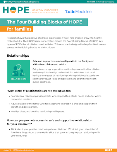 Research shows that positive childhood experiences (PCEs) help children grow into healthy, resilient adults. The Four Building Blocks of HOPE – relationships, environments, engagement, and emotional growth – are key types of PCEs that all children need to thrive.