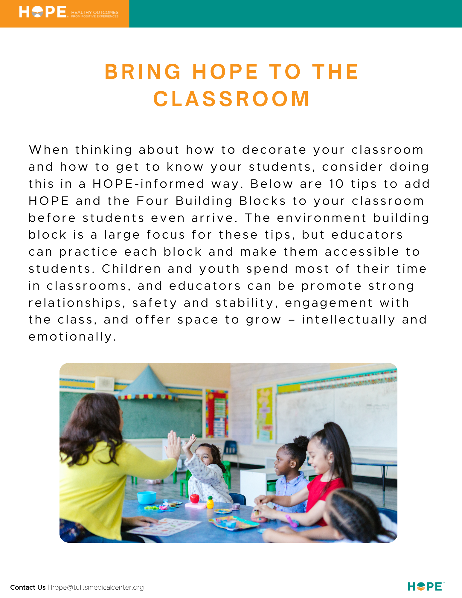 When thinking about how to decorate your classroom and how to get to know your students, consider doing this in a way that promotes positive childhood experiences (PCEs) using the HOPE framework. This resource provides 10 tips to add the HOPE framework and the Four Building Blocks, the key types of PCEs, to your classroom.