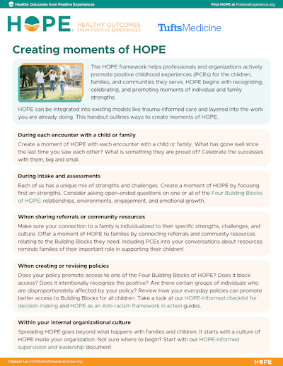 The HOPE framework helps professionals and organizations actively promote positive childhood experiences (PCEs) for the children, families, and communities they serve. HOPE begins with recognizing, celebrating, and promoting moments of individual and family strengths. This handout outlines ways to create moments of HOPE.