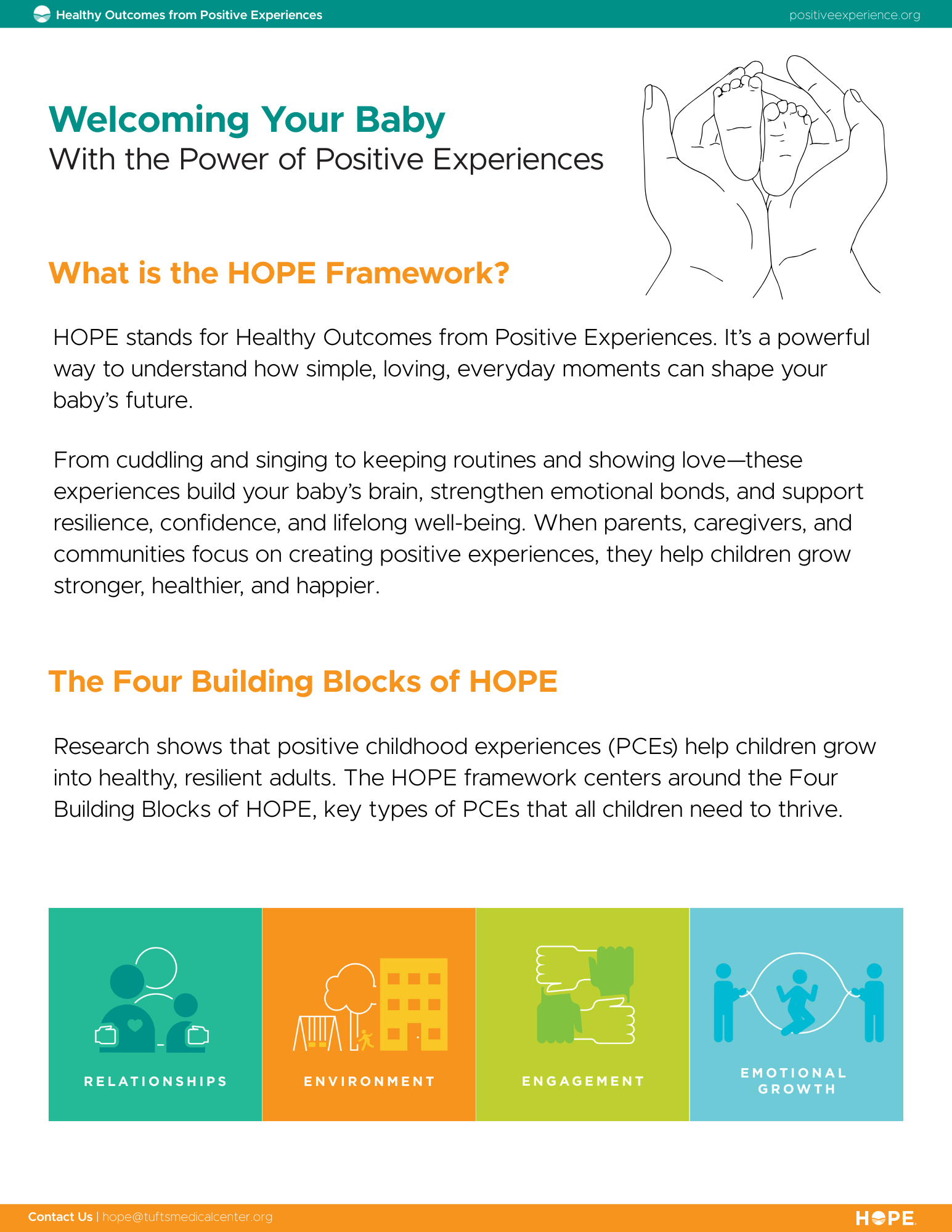 The Healthy Outcomes from Positive Experiences (HOPE) framework is a powerful way to understand how simple, loving, everyday moments can shape your baby’s future. When parents, caregivers, and communities focus on creating positive experiences, they help children grow stronger, healthier, and happier.