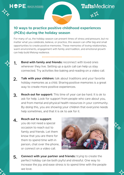 For many of us, no matter what you celebrate, believe, or practice, the holiday season can offer big and small opportunities to create positive memories, even when the season can present times of stress and pressure. These memories of loving relationships, warm environments, engagement with family and tradition, and emotional growth can help build lifelong resilience.