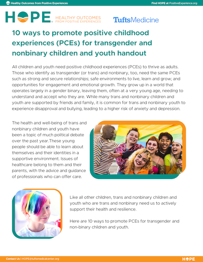 All children and youth need positive childhood experiences (PCEs) to thrive as adults. Those who identify as transgender (or trans) and nonbinary, too, need the same PCEs. This resource provides 10 ways to promote PCEs for trans and non-binary children and youth.