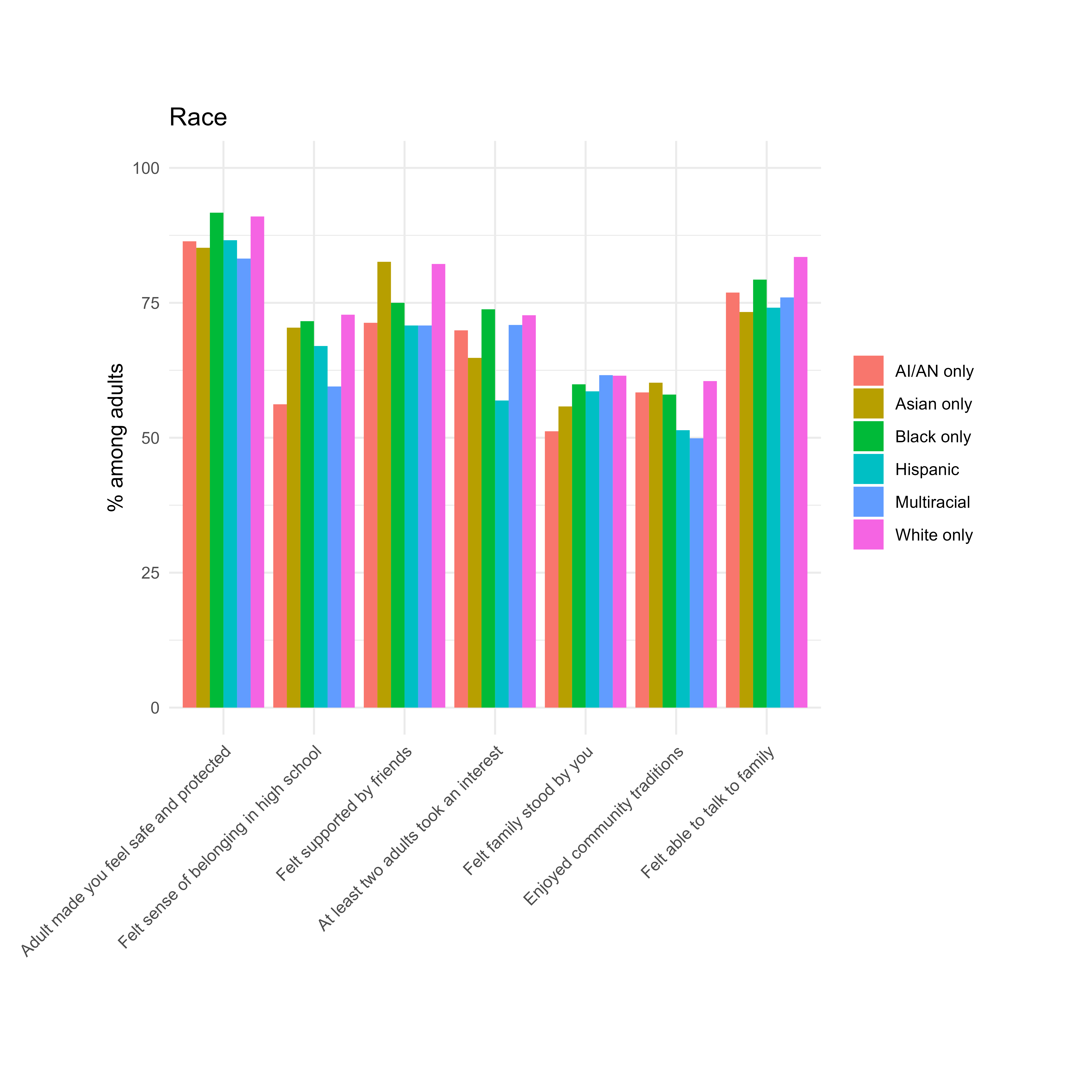 For example, we have found that gender-minority high school students are less likely to be engaged in after-school activities than their peers. With this information, agencies can look further into why this may be happening and create policy changes or more intentional spaces for LGBTQ+ youth after school. This article also suggests that Hispanic Americans and adults with multi-racial backgrounds reported fewer community-level PCEs than non-Hispanic Black or white adults – while the family subscale is not significantly different.
